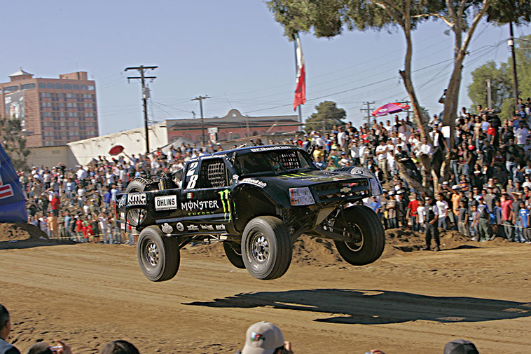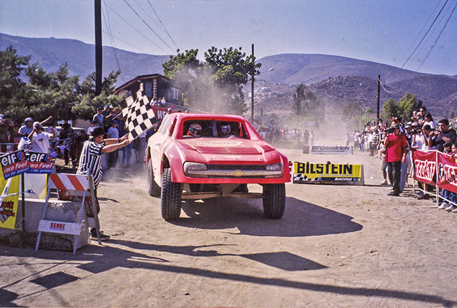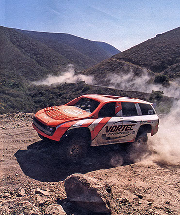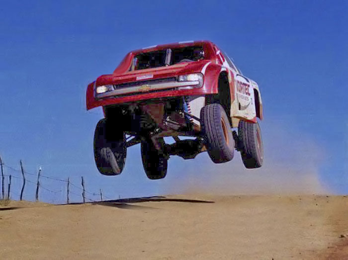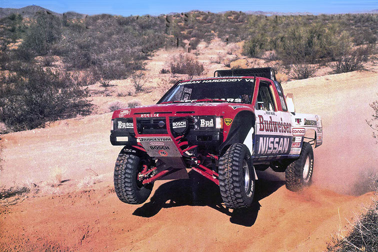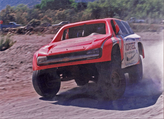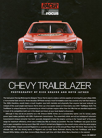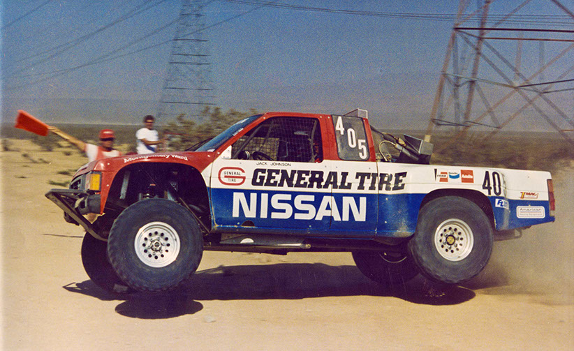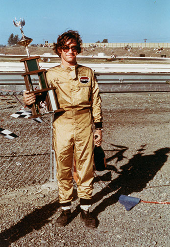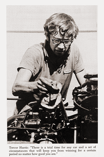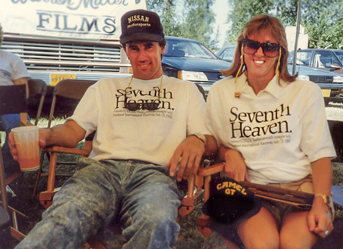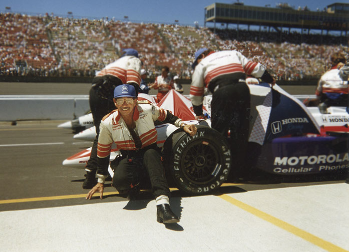 Harris at the races – photo for 2001 calendar – caption: Chassis designer Trevor Harris is the mastermind behind several Nissan creations, including the GTP ZX Turbos, the Nissan 300 ZX Twin Turbo GTO cars, the TMAC Class 4 off-road truck, and the Roger Mears Racing stadium truck.