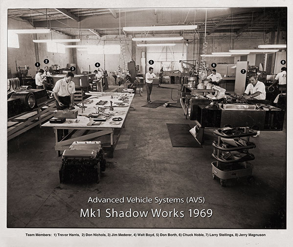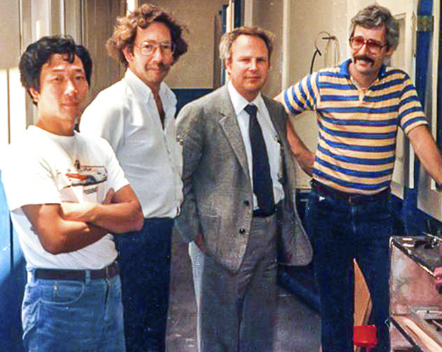 Car parked in NPTI shop, left to right, Kas Kastner, Trevor Harris, Dr. Y Hayashi, Mike Burz.